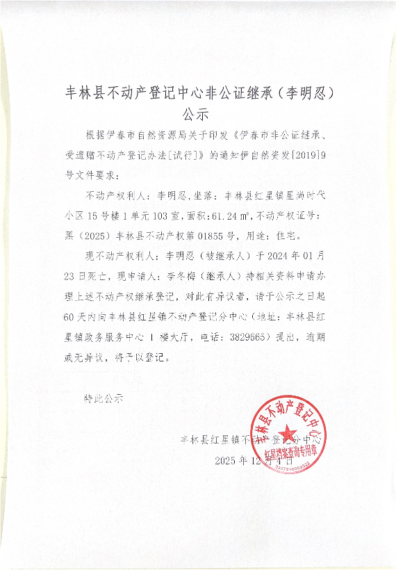 丰林县不动产登记中心非公证继承(李明忍)公示