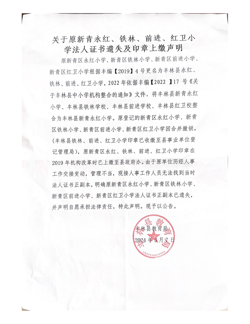 关于原新青永红、铁林、前进、红卫小学法人证书遗失及印章上缴声明