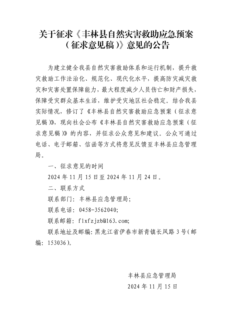 关于征求《丰林县自然灾害救助应急预案(征求意见稿)》意见的公告