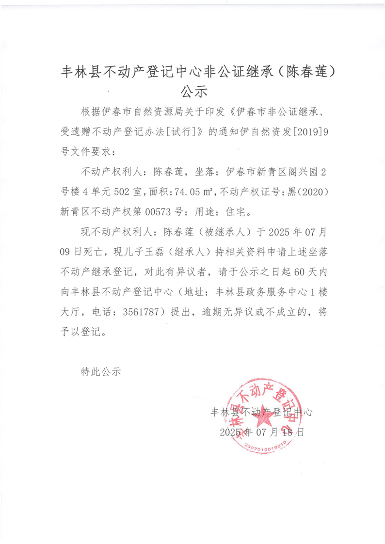 丰林县不动产登记中心非公证继承(陈春莲)公示