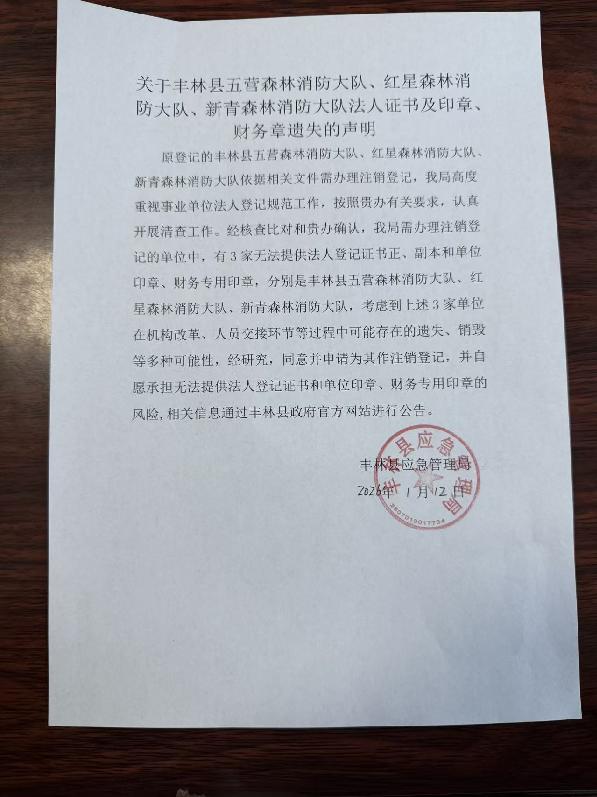 关于丰林县五营森林消防大队、红星森林消防大队、新青森林消防大队法人证书及印章、财务章遗失的声明