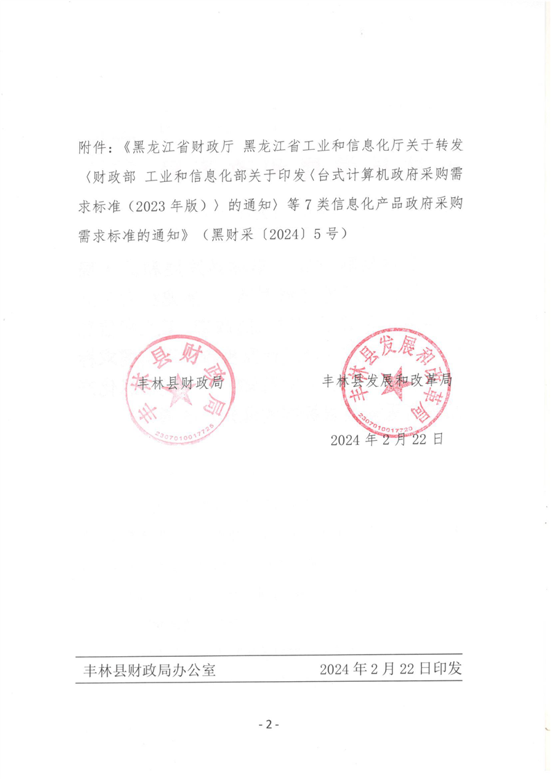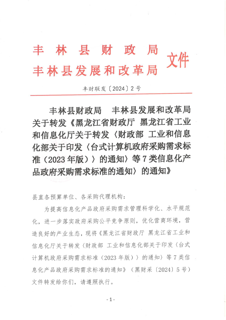 丰林县发展和改革局丰林县财政局:关于转发《黑龙江省财政厅黑龙江省工业和信息化厅关于转发〈财政部工业和信息化部关于印发(台式计算机政府采购需求标准(2023年版)〉的通知)等7类信息化产品政府采购需求标准的通知〉的通知》