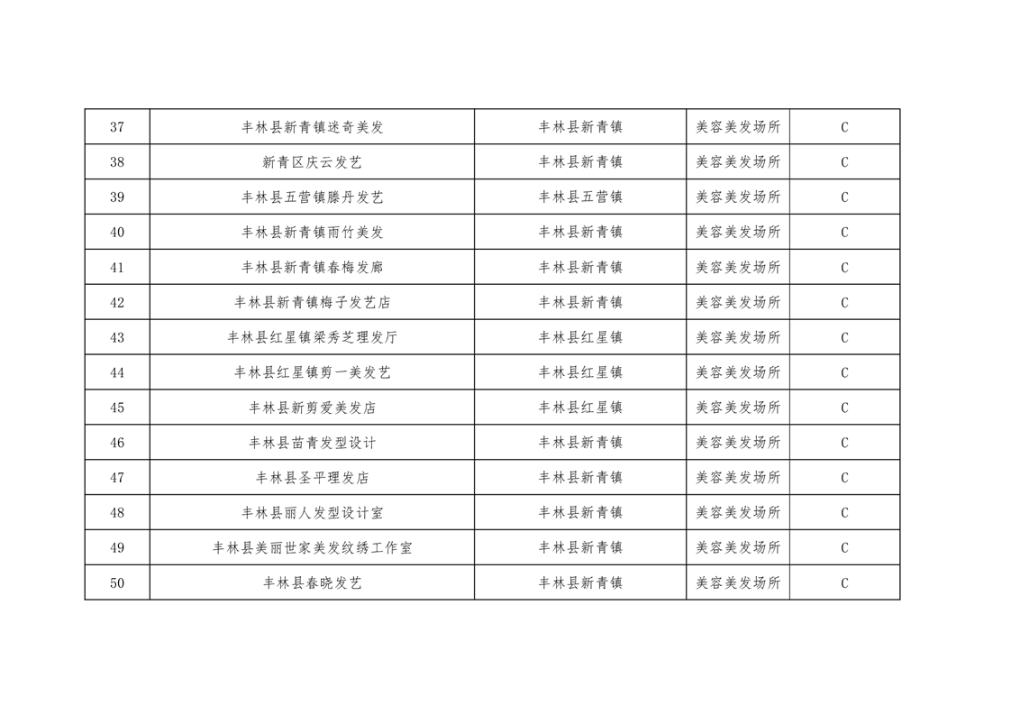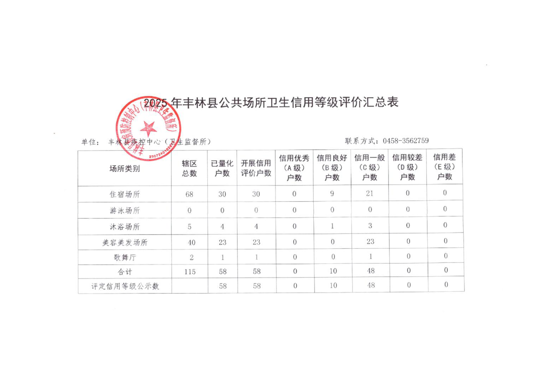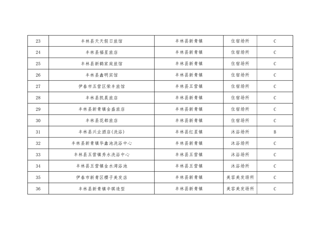 2025年丰林县公共场所卫生信用等级评价汇总表(公示)