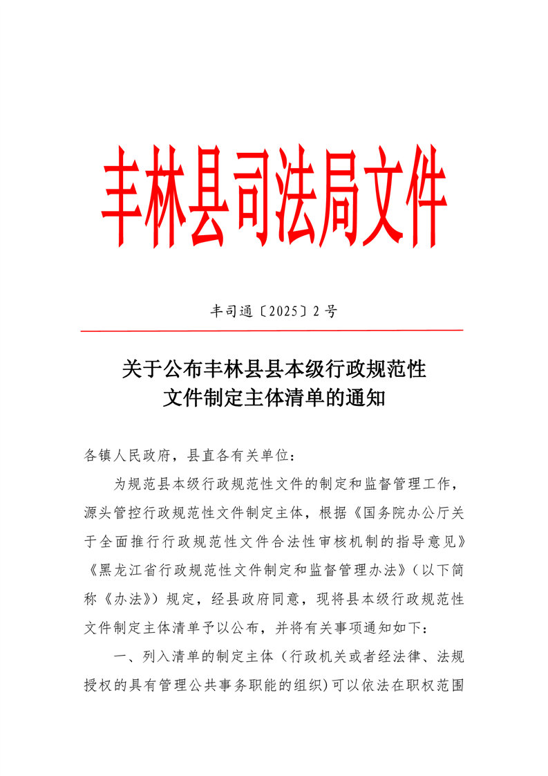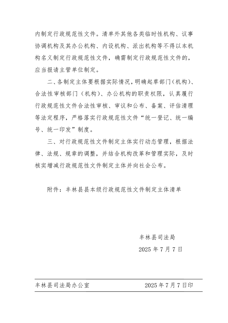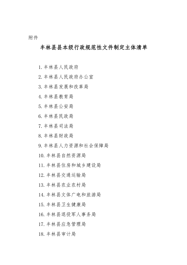 关于公布丰林县县本级行政规范性文件制定主体清单的通知
