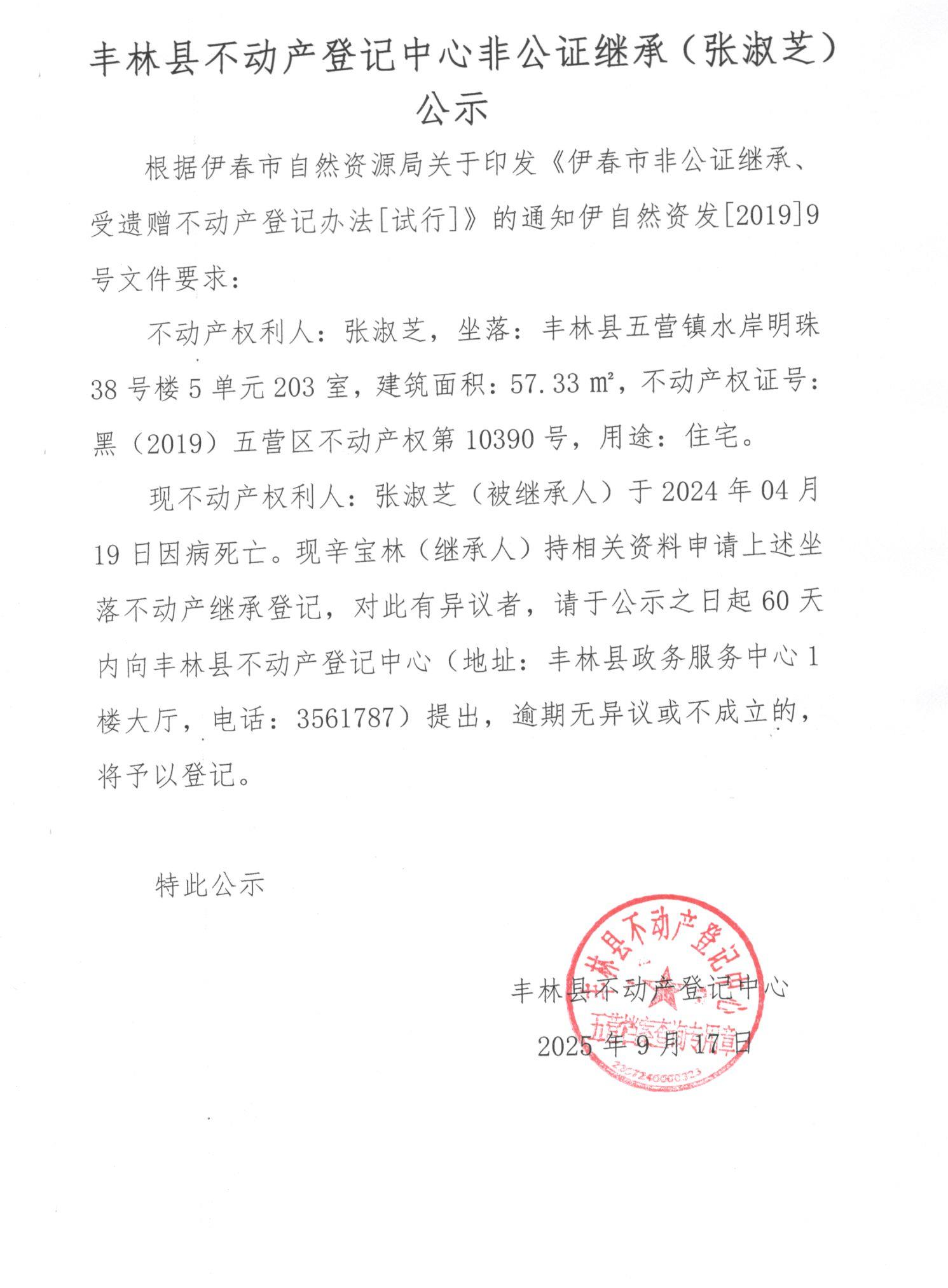 丰林县不动产登记中心非公证继承(张淑芝)公示
