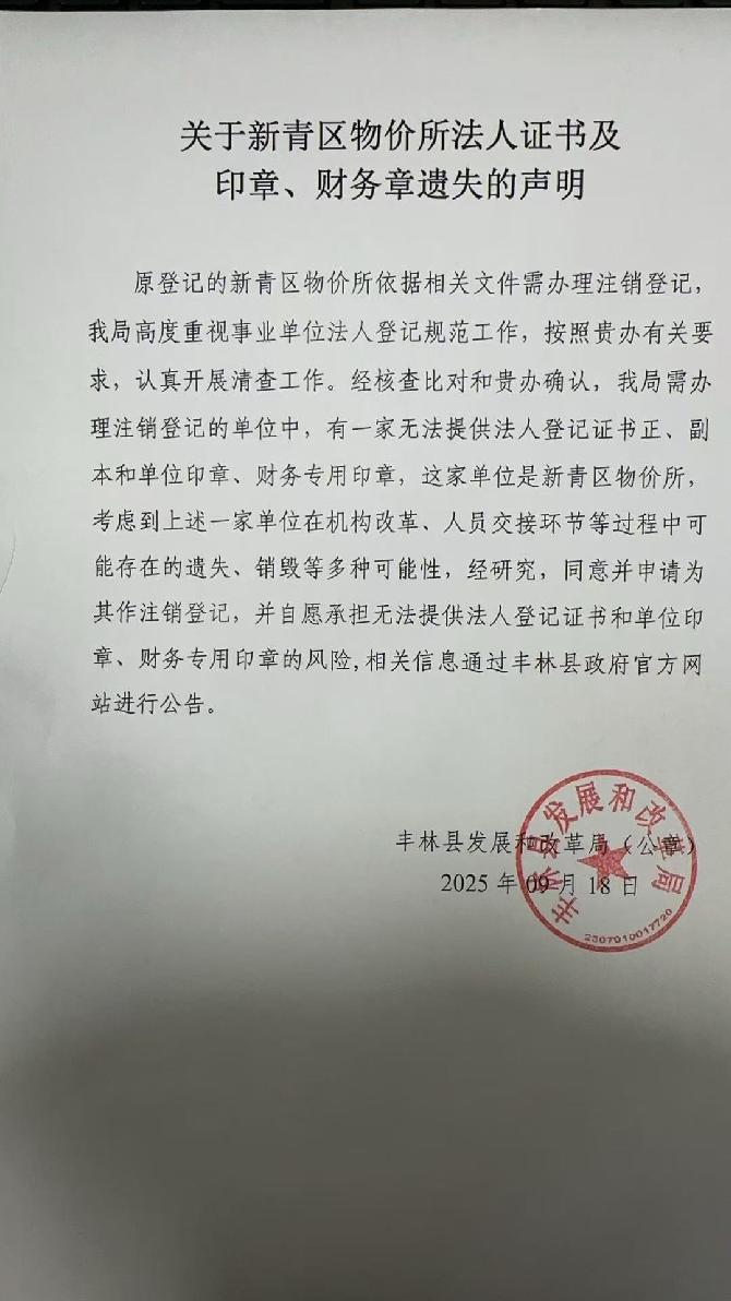 关于新青区物价所法人证书及印章、财务章遗失的声明