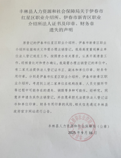丰林县人力资源和社会保障局关于伊春市红星区职业介绍所、伊春市新青区职业介绍所法人证书及印章、财务章遗失的声明
