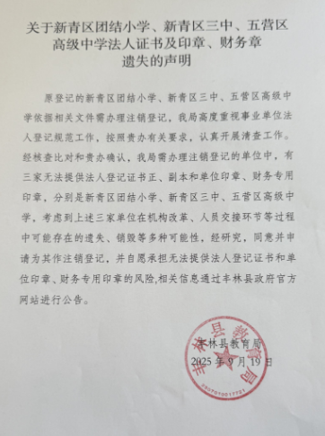 关于新青区团结小学、新青区三中、五营区高级中学法人证书及印章、财务章遗失的声明