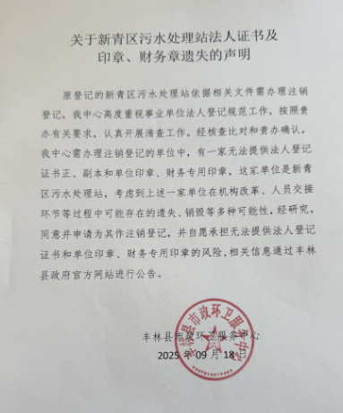 关于新青区污水处理站法人证书及印章、财务章遗失的声明