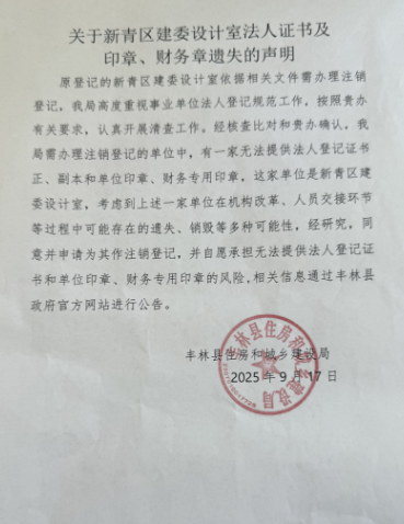 关于新青区建委设计室法人证书及印章、财务章遗失的声明