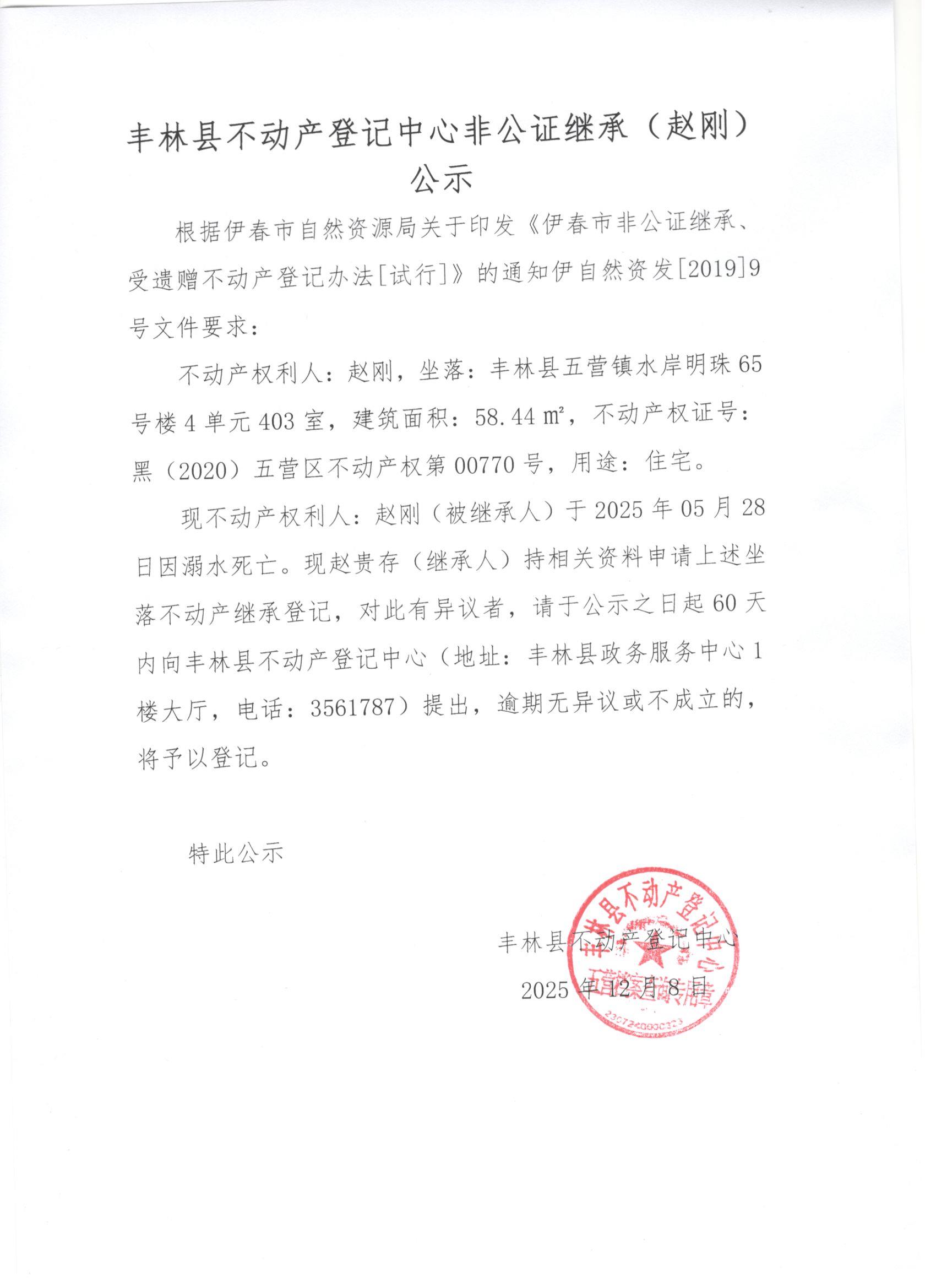 丰林县不动产登记中心非公证继承(赵刚)公示