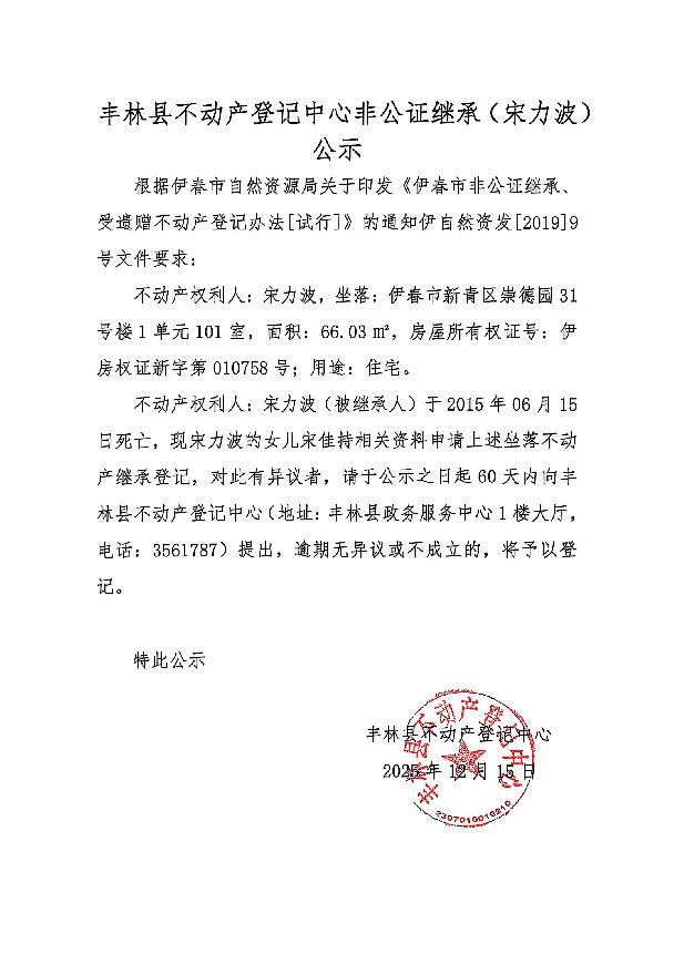 丰林县不动产登记中心非公证继承(宋力波)公示