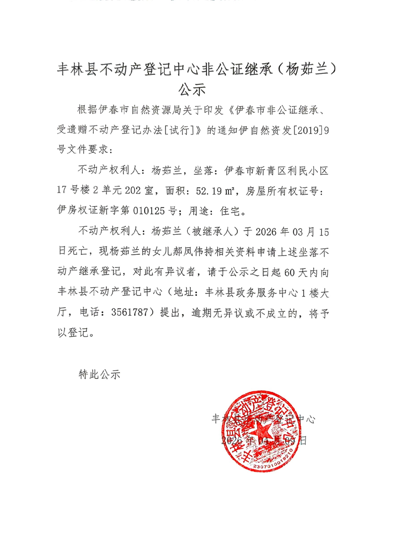 丰林县不动产登记中心非公证继承(杨茹兰)公示