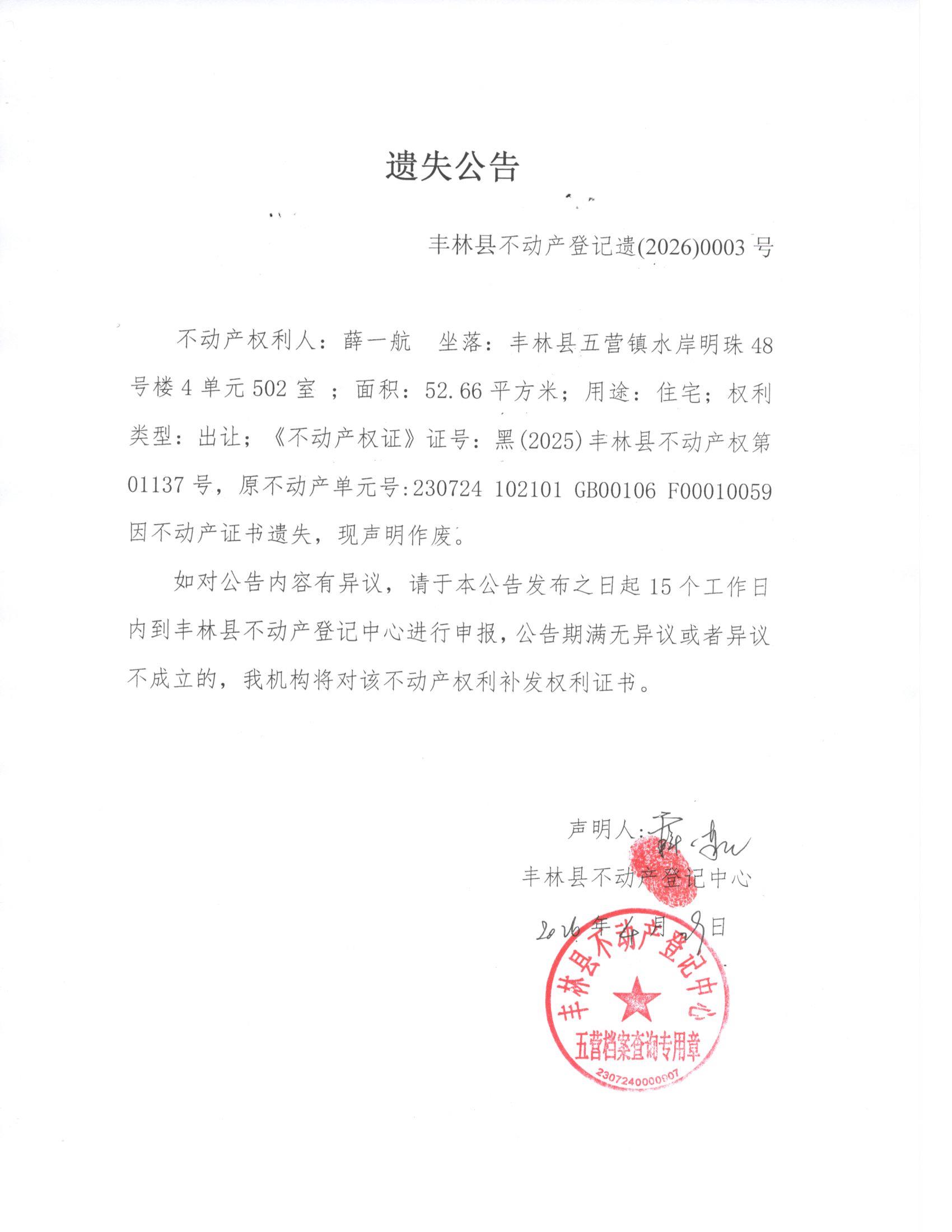遗失公告(薛一航)