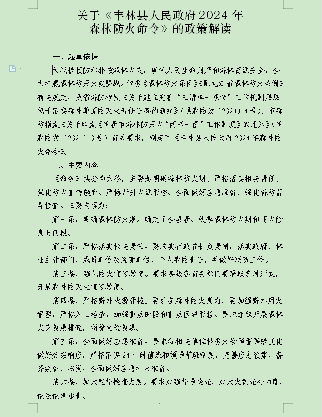 关于《丰林县人民政府2024年森林防火命令》的政策解读