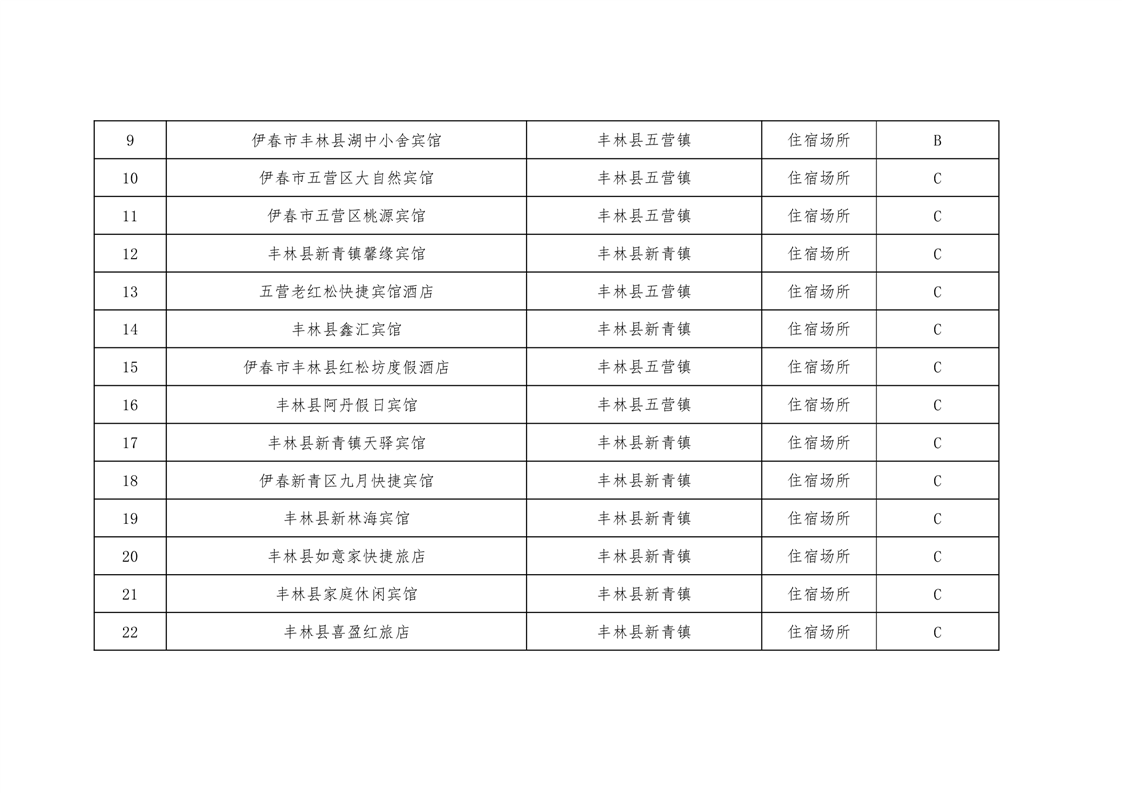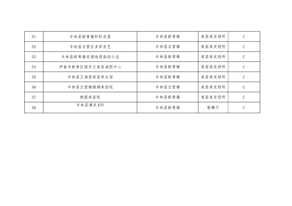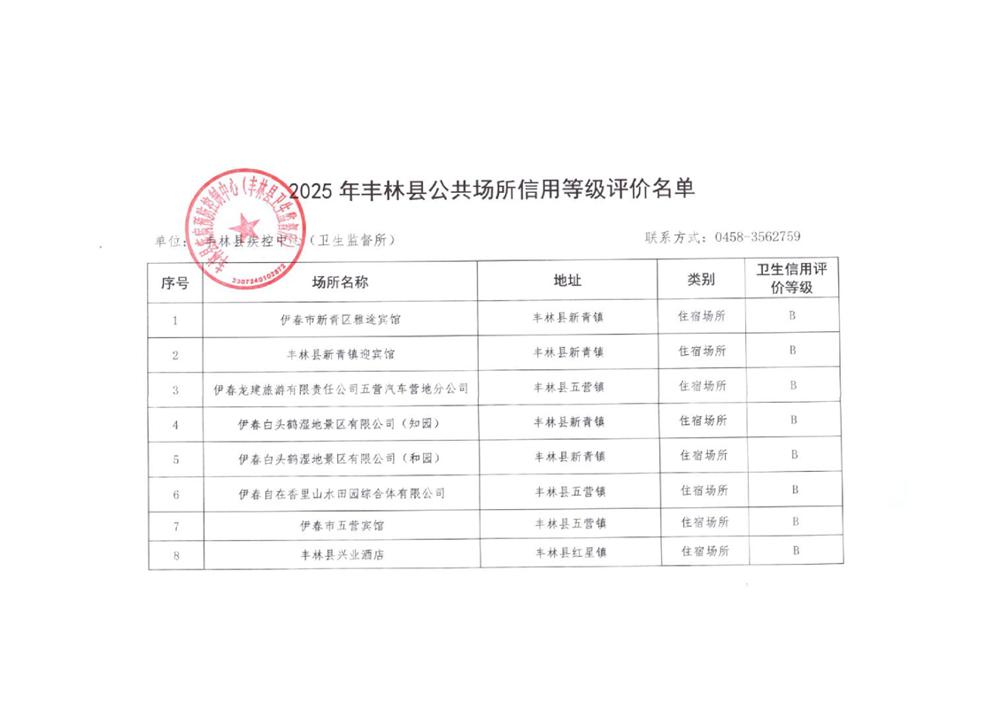 2025年丰林县公共场所卫生信用等级评价汇总表(公示)