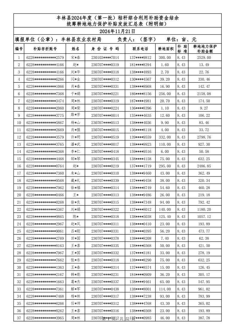 丰林县2024年度(第一批)秸秆综合利用补助资金结余统筹耕地地力保护补贴发放公示