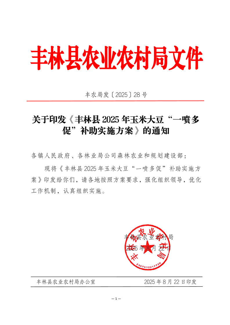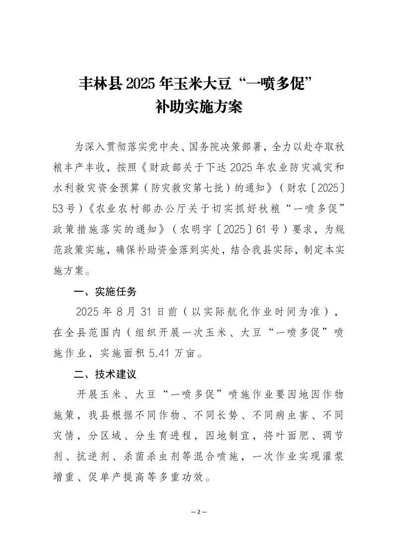 关于印发《丰林县 2025 年玉米大豆“一喷多促”补助实施方案》的通知